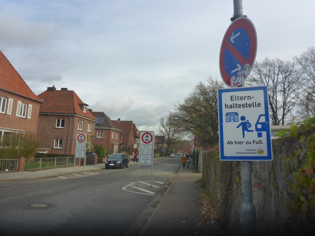 Damit Eltern ihre Kinder trotzdem mit dem Auto zur Schule bringen können, wenn sie es für notwendig erachten, gibt es in der Nähe der Schule eine sogenannte Elternhaltestelle.